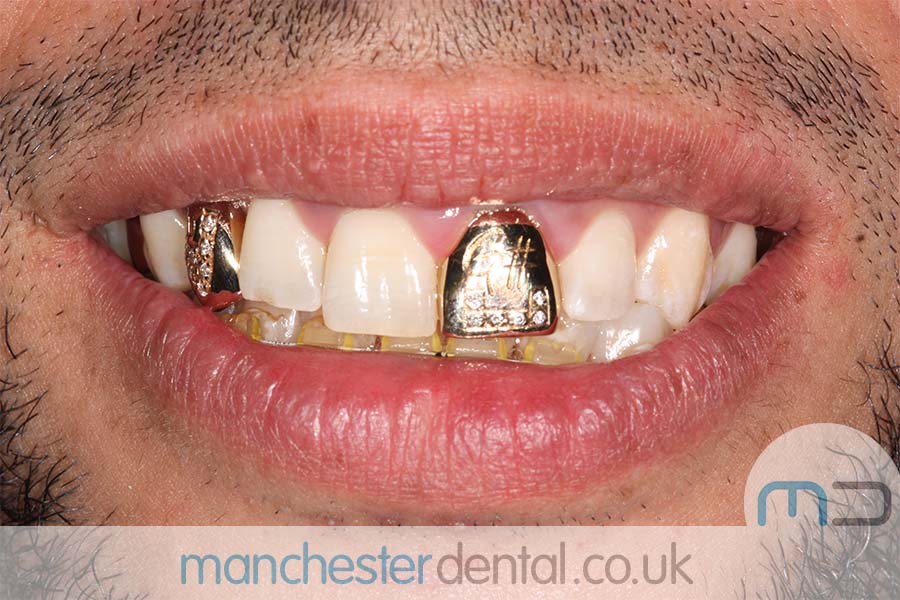 Gold teeth Manchester, with Manchester Dental! Gold teeth are a very popular type of tooth jewellery or tooth art. They are sometimes known as Gold Crowns and also Grills.